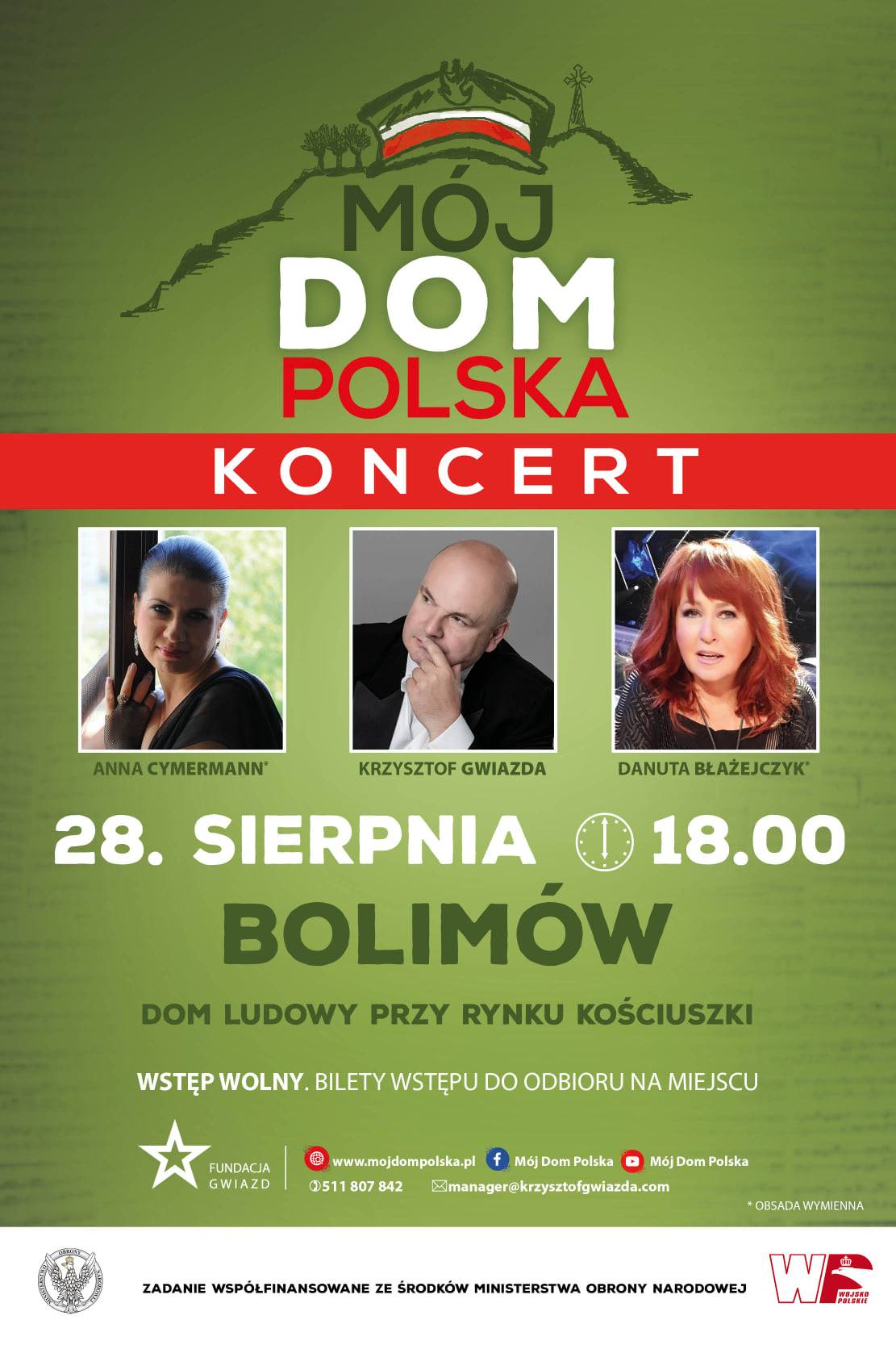 Już w najbliższy piątek, 28 sierpnia o godz. 18.00 w Bolimowie, w budynku tzw. Domu Ludowego, odbędzie się koncert pt. „Mój Dom Polska". Program dofinansowany jest ze środków Ministerstwa Obrony Narodowej.