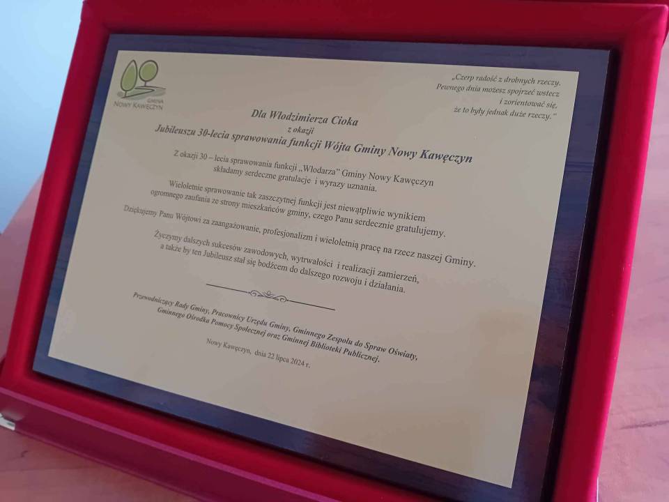 Włodzimierz Ciok obchodził dziś jubileusz 30-lecia sprawowania funkcji Wójta Gminy Nowy Kawęczyn. Z tej okazji otrzymał z rąk Przewodniczącego Rady Gminy, Skarbnika Gminy i Sekretarza Gminy tablicę pamiątkową, kwiaty oraz słodkie upominki.